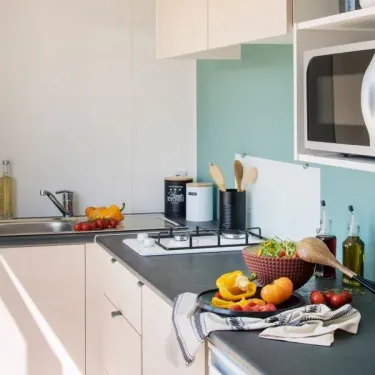 - Plaques gaz, micro-ondes, réfrigérateur, cafetière, vaisselle et ustensiles de cuisine inclus