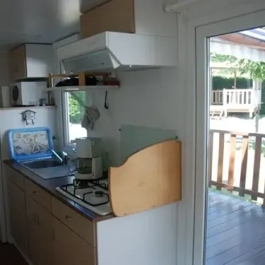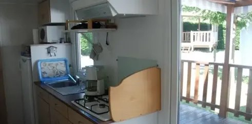 Surface de 28m², 1 chambre avec 1 lit double (140x190), 1 chambre avec 2 lits simples (80x190), cuisine équipée, télévision, salle de bain avec douche, WC séparés, terrasse couverte, salon de jardin...