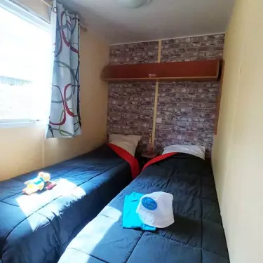 Surface de 24 m², 1 chambre avec 1 lit double, 1 chambre avec 2 lits simples, salle de bain avec douche, WC séparés, terrasse semi-couverte, salon de jardin...