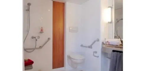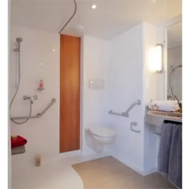 - douche monobloc avec siège intégré et barre de maintien, cuisine avec accès sous le plan de travail, penderie avec bras télescopique