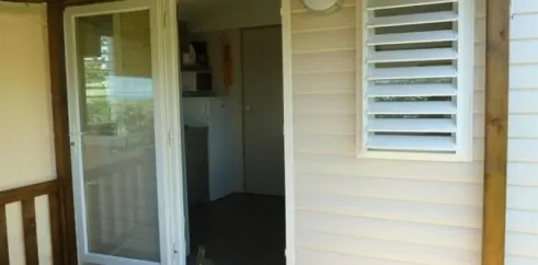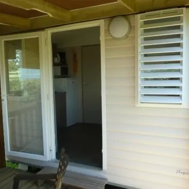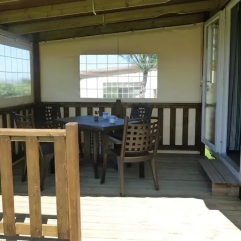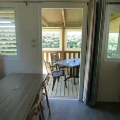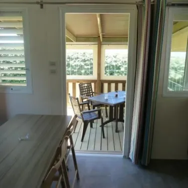 Surface de 27 m², une chambre avec lit double, coin cuisine, douche et WC, terrasse couverte...
