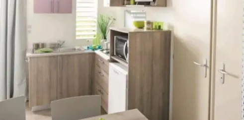 - Cuisine équipée avec réfrigérateur, four micro-ondes, cafetière électrique, ustensiles de cuisine, vaisselles, couverts