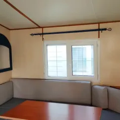 - Banquette convertible en lit 2 places au salon (130cm x 190cm, constitué avec les coussins), table, chaises, climatisation, télévision