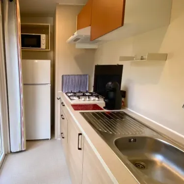 - Plaques gaz, micro-ondes, grand réfrigérateur, vaisselle et ustensiles de cuisine inclus, cafetière à capsules (Dolce Gusto)