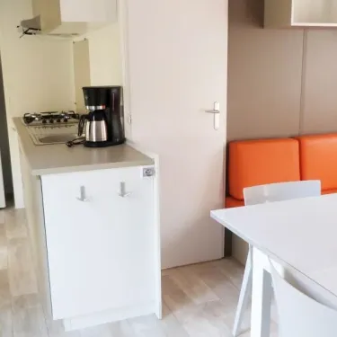 - Plaques gaz, micro-ondes, réfrigérateur, vaisselle et ustensiles de cuisine inclus, cafetière à capsules (Dolce Gusto)