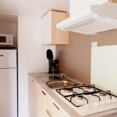 - Cuisine équipée avec frigo, 4 feux gaz, vaisselle, cafetière, micro-ondes
