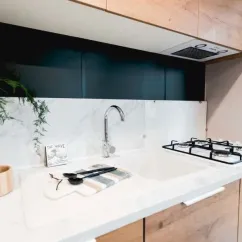 - 2 x plaque gaz 4 feux, frigo congélateur, micro-ondes, cafetière électrique, grille pain, bouilloire