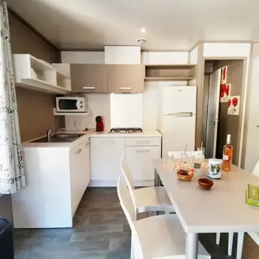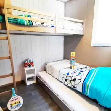 34.9 m² de surface, chambre avec 1 lit double, 1 chambre avec 1 lit superposé et 1 lit gigogne, coin cuisine, salle d'eau, WC, terrasse en bois…