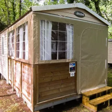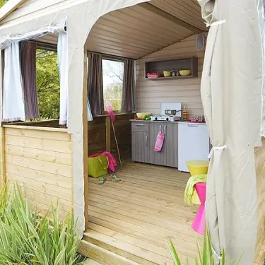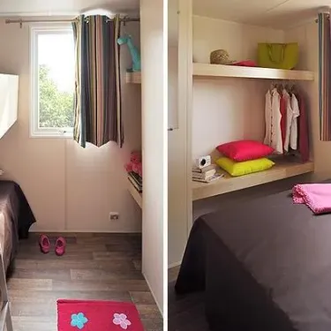 Chambre parents avec 1 lit de 140 x 190 cm, Chambre enfants avec 2 lits de 80 x 180 cm, et 1 lit gigogne, kitchenette équipée sur terrasse extérieure, équipements collectifs pour douche et sanitaires. Aucun accès d'eau dans cet hébergement, pas d'eau courante (pas d'évier).