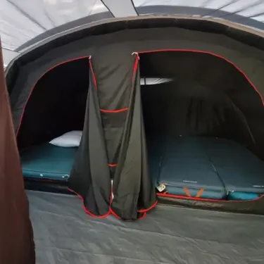- D'une tente 2 chambres, chacune équipée de matelas autogonflant avec sommiers, oreillers et une petite penderie