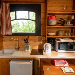 - Plaques de cuisson, micro-ondes, réfrigérateur, cafetière, vaisselle et ustensiles de cuisines inclus
