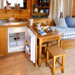 - Cuisine avec cafetière senseo, bouilloire, micro-ondes, réfrigérateur, évier, plaque électrique, vaisselle (couverts, verre, assiette, bol, tasse, casserole, poêle, ouvre-bouteille)