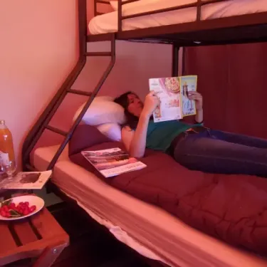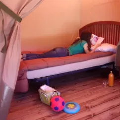 - Enfants : 1 lit double (140x190) et lit simple en mezzanine (70x190), couettes, oreillers