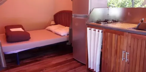 Surface de 30m², 1 chambre avec 1 lit double (140x190), 1 chambre avec 1 lit double (140x190) et lit simple en mezzanine (70x190), pas de sanitaires (sanitaires du camping), terrasse, salon de jardin...