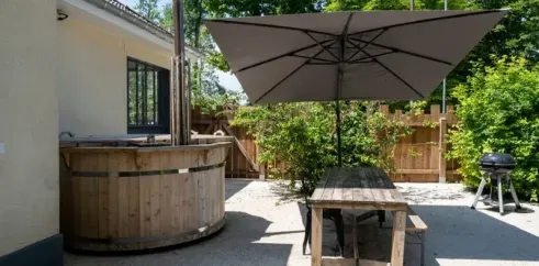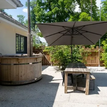 Surface de 85 m², 1 chambre avec lit double, 1 chambre avec lit double, 1 chambre avec lit simple et lit tiroir, lit superposé, salle d'eau avec lavabo, douche et WC séparés, terrasse, table, banc, parasol, bain finlandais...