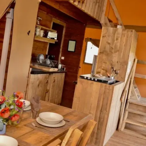 Tente de 25 m² composée de 2 chambres, dont une chambre parents et une chambre enfants avec deux lits superposés. Vous y trouverez aussi une terrasse, un salon équipé ainsi qu'une cuisine et une salle à manger.