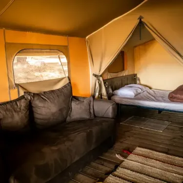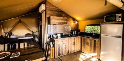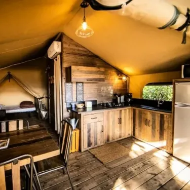 Tente de 30 m² composée de 2 chambres, dont une chambre parents et une chambre enfants avec deux lits superposés et un lit simple. Vous y trouverez aussi une terrasse, un salon équipé ainsi qu'une cuisine et une salle à manger.