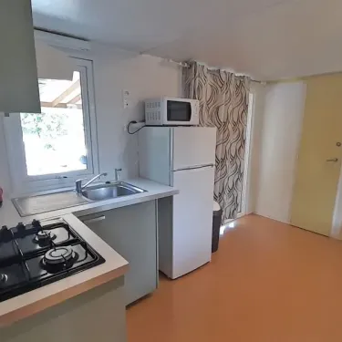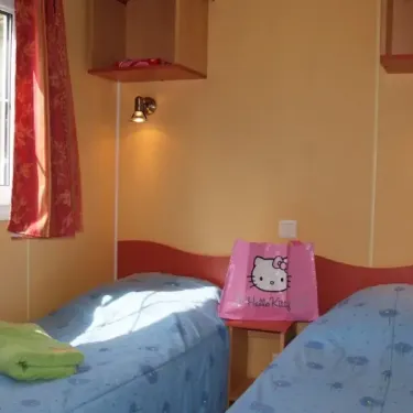 32 m² de surface, chambre avec 1 lit double, 2 chambres avec 2 lits simples, séjour convertible, coin cuisine, salle d'eau, WC séparés, Terrasse en bois extérieure semi-couverte…