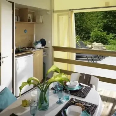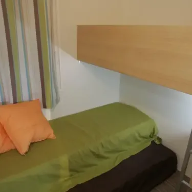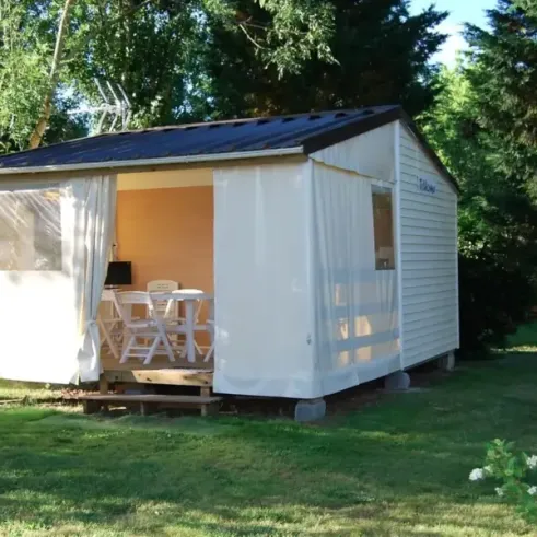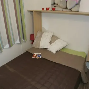 Surface de 20,80 m², 1 chambre avec lit double, 1 chambre avec deux lits superposés et un lit gigogne, pas de WC, ni de salle de bain (équipements sanitaires du camping), terrasse bâchée...