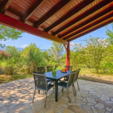 - Terrasse couverte ou stores, salon de jardin, deux chaises longues