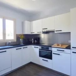 - Plaques cuisson, cafetière, réfrigérateur-congélateur, lave-vaisselle, micro-ondes, bouilloire, vaisselle et ustensiles de cuisines inclus