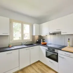- Plaques cuisson, cafetière, réfrigérateur-congélateur, lave-vaisselle, micro-ondes, bouilloire, vaisselle et ustensiles de cuisines inclus