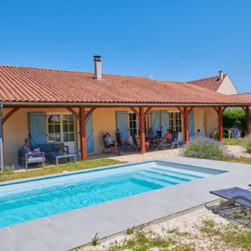 - Terrasse couverte avec salon de jardin, quatre chaises longues, piscine privée chauffée