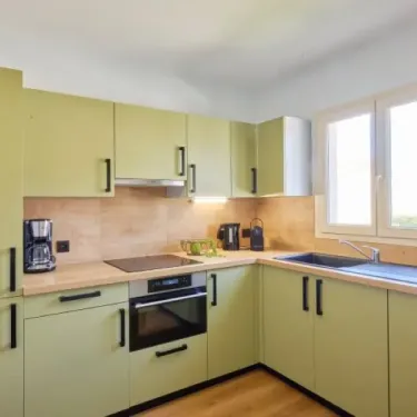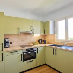 - Plaques cuisson, cafetière, réfrigérateur-congélateur, lave-vaisselle, micro-ondes, bouilloire, vaisselle et ustensiles de cuisines inclus