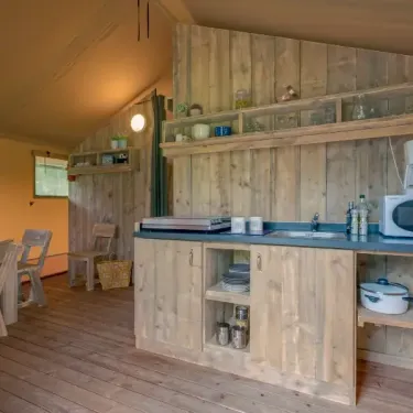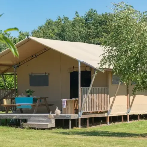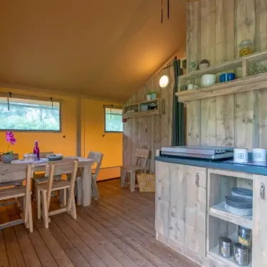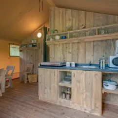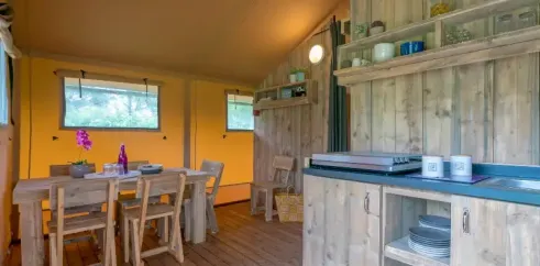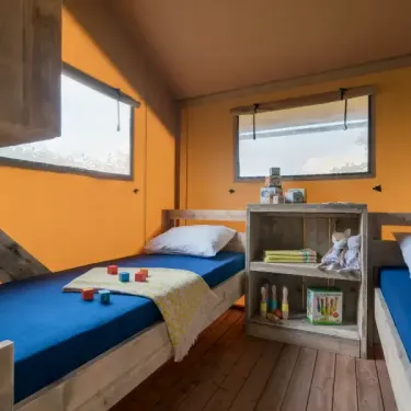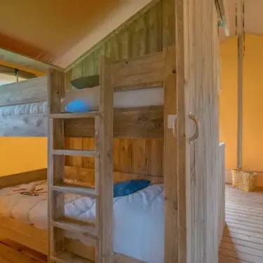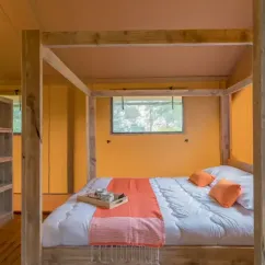 Surface de 35 m², 1 chambre avec lit double de 160x200cm, 2 chambres avec 2 lits simples de 80x200cm, pas de WC ni de salle de bain (équipements sanitaires du camping), terrasse extérieure...