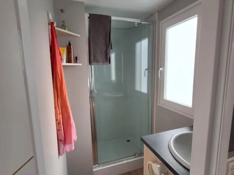 18 m² de surface, une chambre avec un lit double, une chambre avec deux lits simples, coin cuisine, douche, lavabo et WC séparés, terrasse...