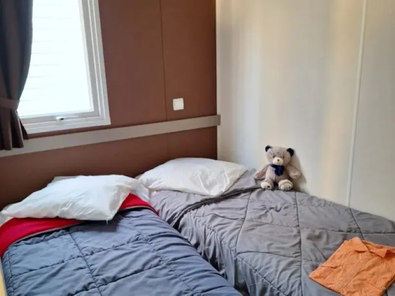 21.60 m² de surface, une chambre avec un lit double, une chambre avec deux lits simples, coin cuisine, douche, lavabo et WC séparées, terrasse...