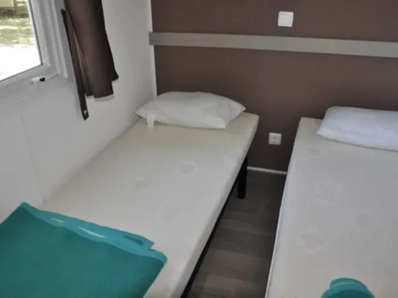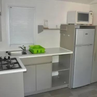 28.60 m² de surface, une chambre avec un lit double, deux chambres avec deux lits simples, une banquette convertible, coin cuisine, douche, lavabo et WC séparés, terrasse...