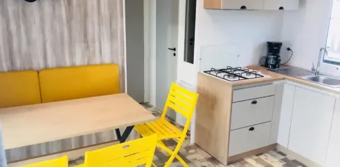 30 m² de surface, chambre avec 1 lit double, 2 chambres avec 2 lits superposés, salle d'eau avec lavabo, douche et WC séparés, télévision, cuisine équipée, terrasse avec salon de jardin...