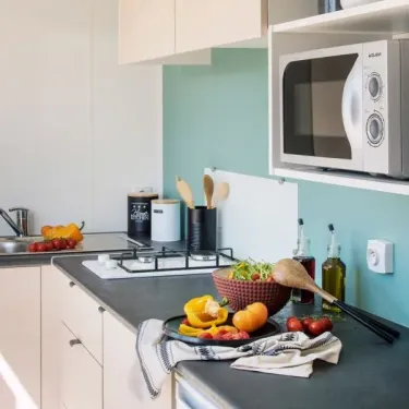 - Plaques gaz, micro-ondes, réfrigérateur, cafetière, vaisselle et ustensiles de cuisine inclus