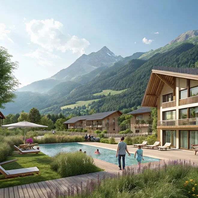 Les familles pourront également profiter des piscines du parc pour se détendre après une journée de randonnée ou de vélo. L'environnement naturel et paisible du parc offre un cadre idéal pour se ressourcer, avec des espaces extérieurs et des installations dédiées à la relaxation et au bien-être. Les plus jeunes pourront se divertir sur les aires de jeux, tandis que les adultes pourront profiter de moments de tranquillité en admirant les paysages alpins.