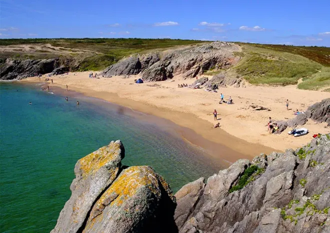 L’île d’Houat au large de la baie de Quiberon dispose d’une plage de plus de 2 km bordée par un cordon dunaire. Treac’h er Goured se situe à l’est de l’île et la vue permet d’apercevoir la presqu’ile de Guérande.