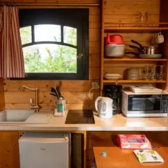 - Cuisine avec cafetière classique, bouilloire, plaque, micro-ondes, réfrigérateur, évier, vaisselle (couverts, verre, assiette, bol, tasse, casserole, poêle, ouvre-bouteille)